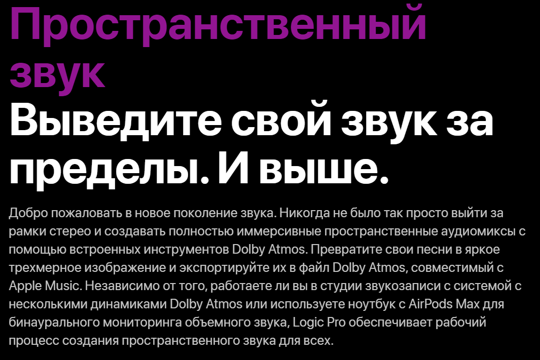 т. е. теперь то, что ранее делалось с помощью стороннего ПО Dolby Atmos Production Suite, интегрировано внутрь Logic PRO.Интегрированные инструменты Dolby Atmos для микширования и экспорта песен в виде пространственного звука.