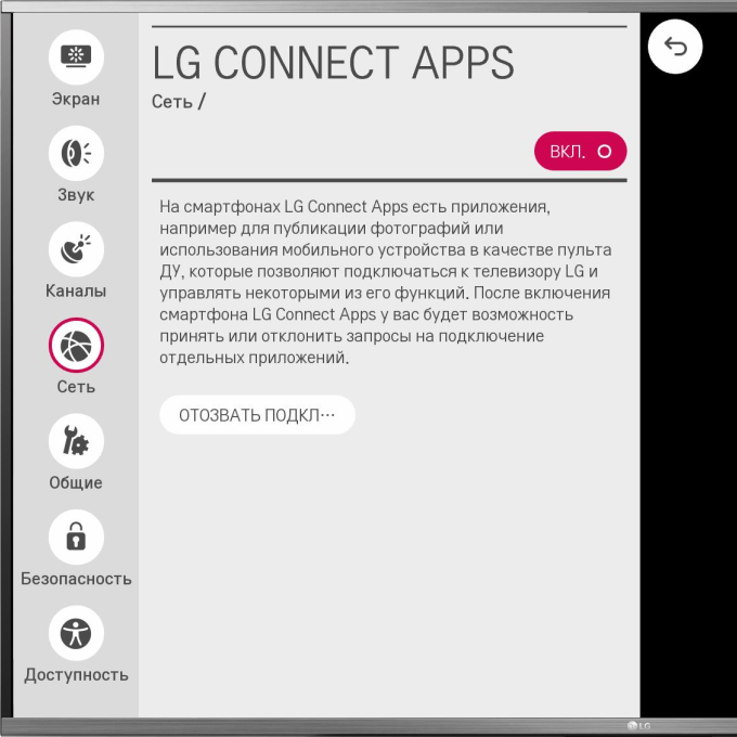 2. В телевизоре проверьте, что включена опция: Настройки ? Сеть ? LG Connect Apps.