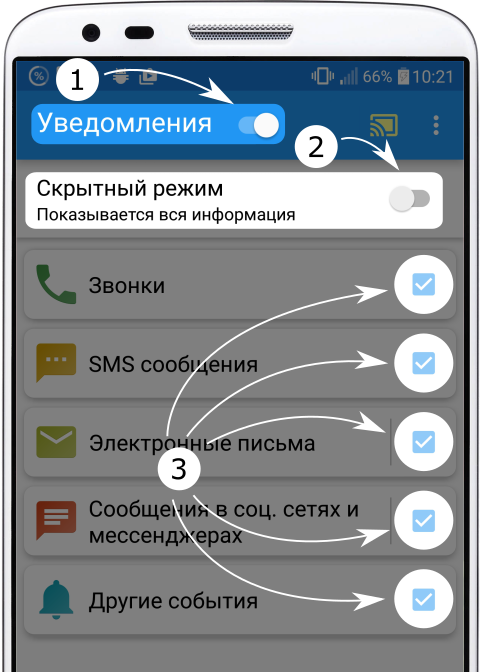 6. Проверьте, что включен переключатель "Уведомления" (1), установите уровень приватности (2) и выберите нужные уведомления (3).
