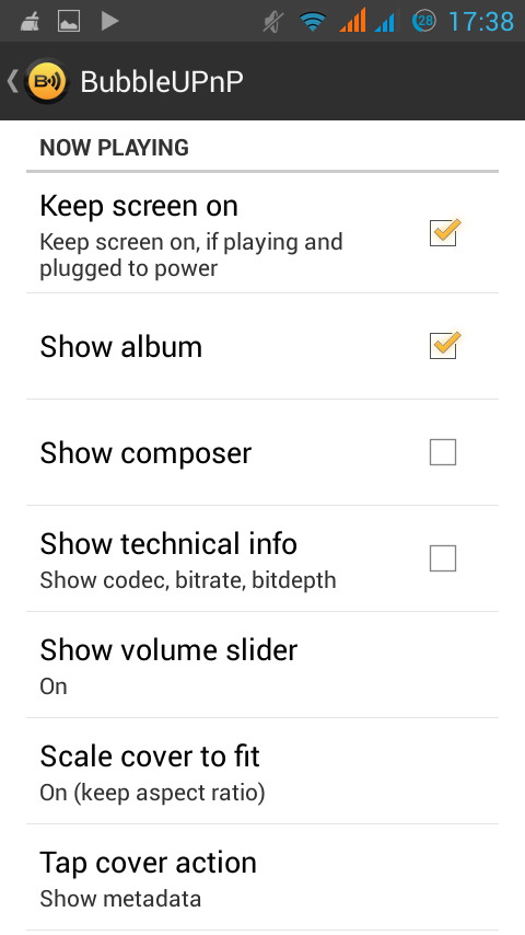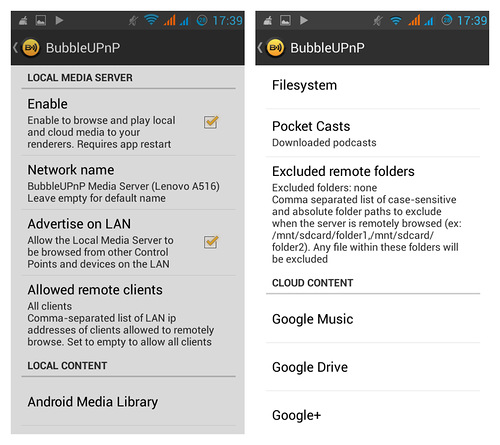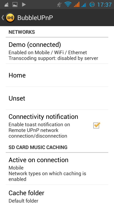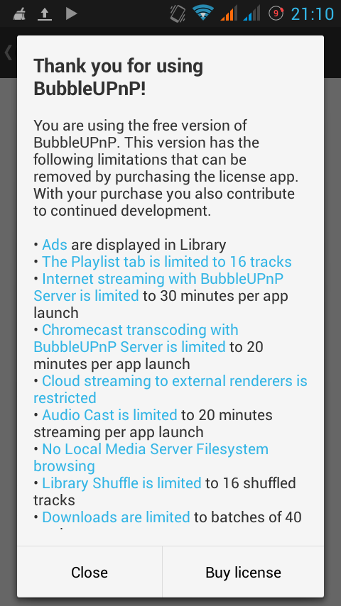 В настоящее время BubbleUPnP требуется Wi-Fi для подключения к локальной сети. Он не поддерживает виртуальные частные сети (VPN) и другие виды связи (их поддержка возможно будет добавлена в будущем). Внешний медиа-сервер в вашей локальной сети обязателен. Отправка изображений/фотографий на UPnP renderers не поддерживается, хотя вы можете просматривать и загружать их на своё устройство.