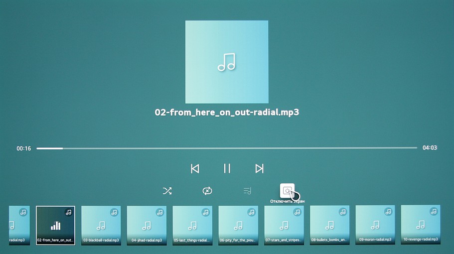 На телевизорах LG 2021 года в качестве аудиофайлов поддерживаются множество распространенных и не очень форматов, как минимум AAC, MP3, OGG, WMA (в т. ?ч.lossless и 24 бит), M4A, WAV и FLAC (расширение должно быть именно FLAC). Поддерживаются тэги как минимум в MP3 и OGG, картинки-обложки в MP3 и тексты песен в тех же MP3. Экран ТВ можно отключить на время воспроизведения аудиофайлов.