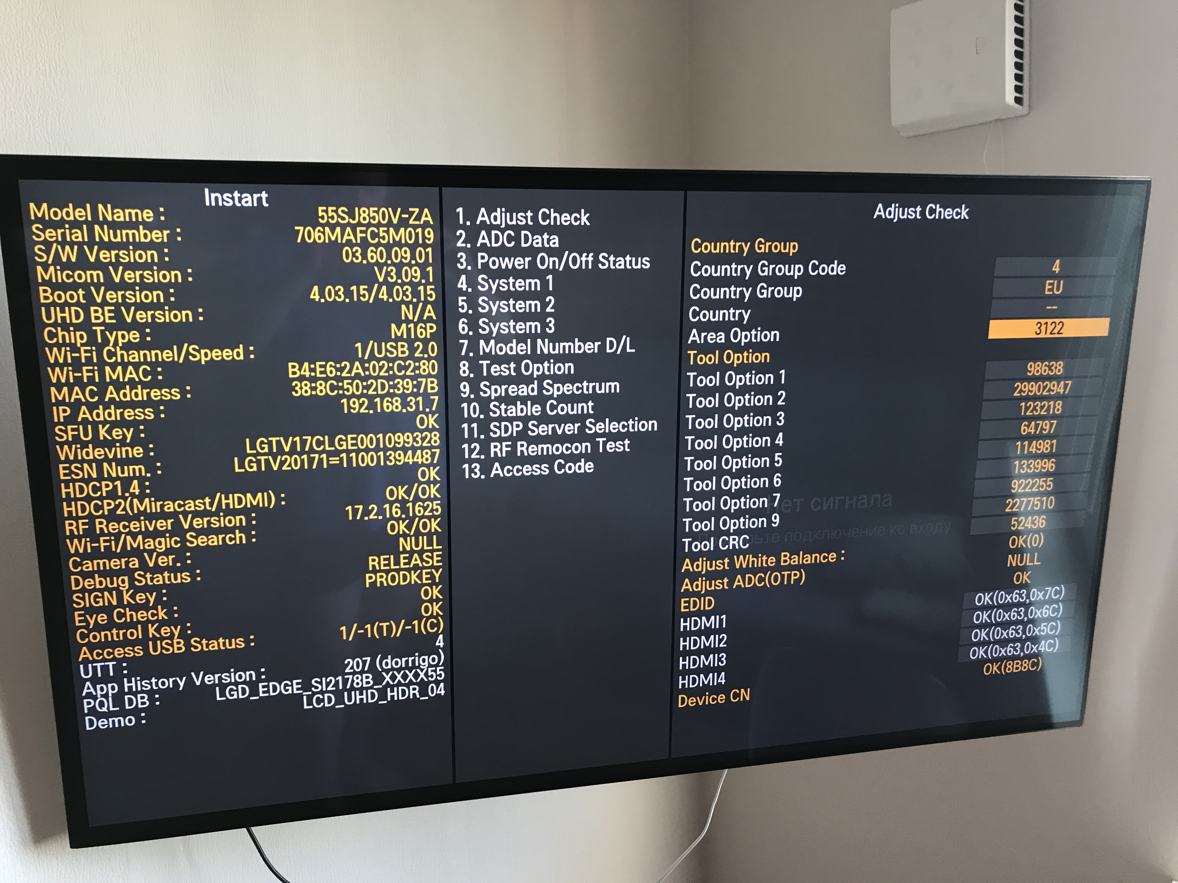 2) не могу поменять регион - тв сбрасывал в дефолты пару раз, доступные регионы в прошивке - мексика, сша, канада, другой регион - ставил сша и другой регион. прошивка стоит последняя, официальных обновлений нет, на сайте LG/support оф. прошивок ноль. в EZAdjust получилось зайти с помощью светодиода на джейке.. пароль принимает и по меню перемещается но регион стоит 02/US и не меняется хотя цифра 02 подсвечена оранжевым.. все стрелочки-циферки с пульта попробовал.. в менюшке, где смена регион кода есть надпись нажать ok для изменения, и на нажатия клавиши ok - реакции также нет (возможно потому, что значения не изменены но мб он просто виснет? ). пробовал менять значения пультами LG AKB74915304 (штатный к этому тв), AKB73756565 и AN-MR500G (штатный и Magic remote от LG LB652V) - по меню перемещается но не меняет, также пробовал подключать клавиатуру logitech k400 plus/microsoft wireless keyboard 3000 - по меню не перемещается/ввод пароля в сервисное меню цифрами не проходит. в меню IN START заходит но там тоже не меняется регион.. и как я понимаю не должен меняться через него.