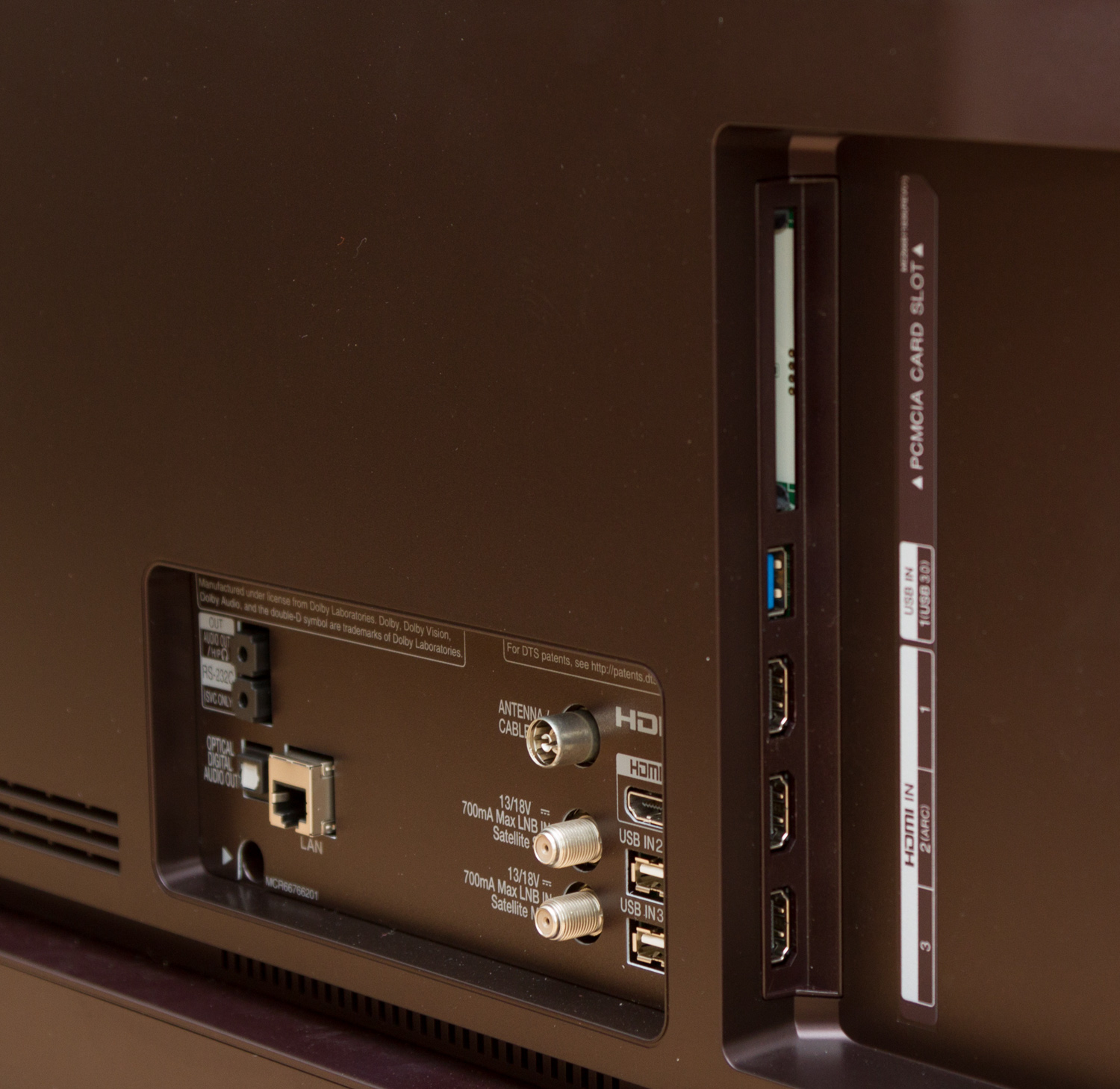 Кроме стандартного антенного входа можно увидеть один вход спутникового тюнера, выполненного в виде разъема F-типа. К интернету и домашней сети можно подключиться через Ethernet RJ-45 порт или беспроводный встроенный Wi-Fi адаптер, а сервисное обслуживание использует порт RS232.