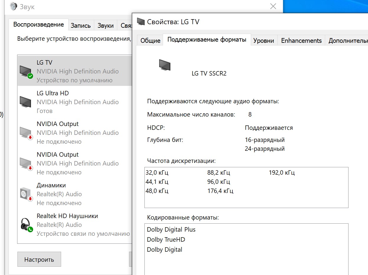 premium77 писал(а):Тоже Windows 10, видеокарта rx560. Купил телик с поддержкой 4К HDR, а ресивер пропускает только 4К, с HDR не работает. Пришлось ПК напрямую к ТВ подключить. На подходе тоже покупка нового ресивера, в районе 30000 руб. стоит. Стараюсь обойтись без этой крайней меры. Вот пробую через ARC-канал звук на старый ресивер пустить, а Windows определяет ТВ как стереоЗвук 5.1 на ресивер не идёт. При просмотре с флешки всё ОК.