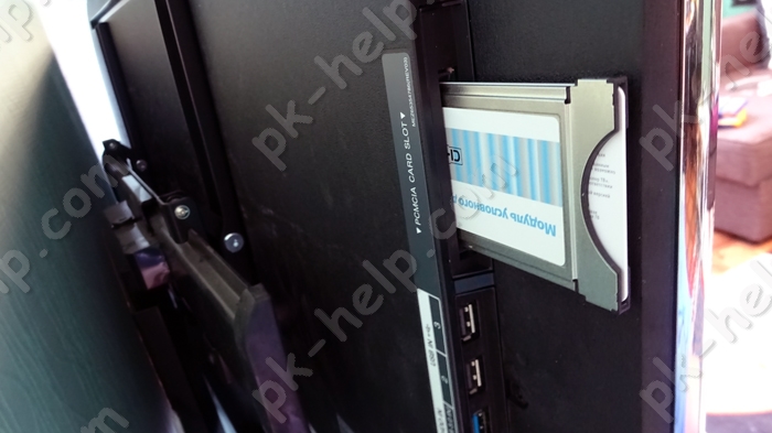 Затем выключите телевизор и вставьте CAM модуль в специальный слот (PCMCIA слот), обычно он располагается на задней боковой панели телевизора. Модуль необходимо вставлять лицевой стороной к стене.
