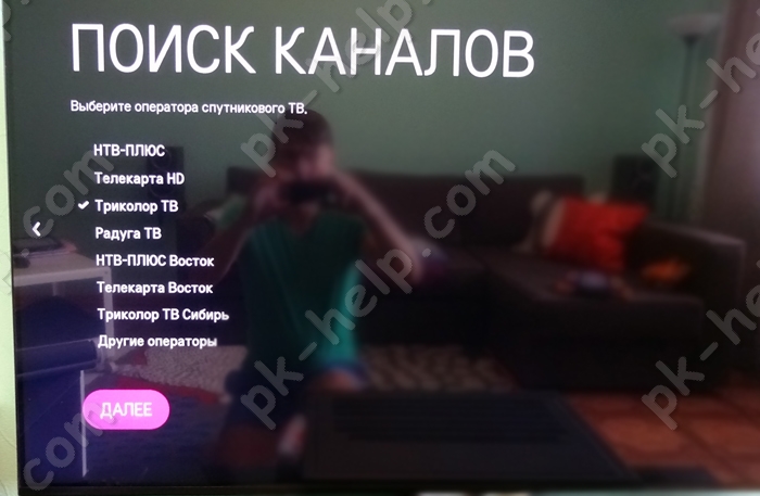 Если вы используете общепопулярного оператора Триколор, НТВ+ и др., то на следующем шаге просто нажмите "Далее", иначе нажмите "Настройка" и внесите настройки соответствующие вашему спутниковому оператору.