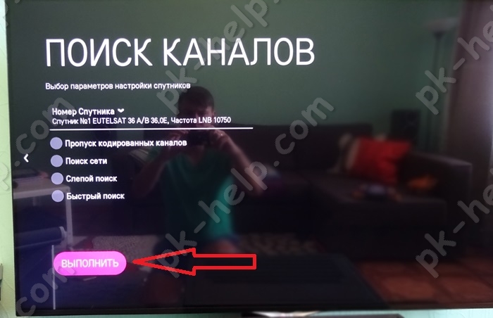 Следующим шагом, нажмите "Выполнить" что бы запустить поиск каналов. Так же можно указать более точный поиск выбрав, например - Пропуск кодированных каналов и т.д.