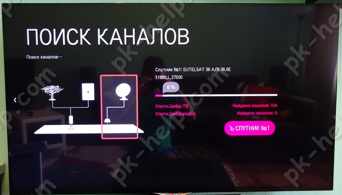 Начнется автоматический поиск спутниковых каналов, необходимо подождать несколько минут, прежде чем он закончится.