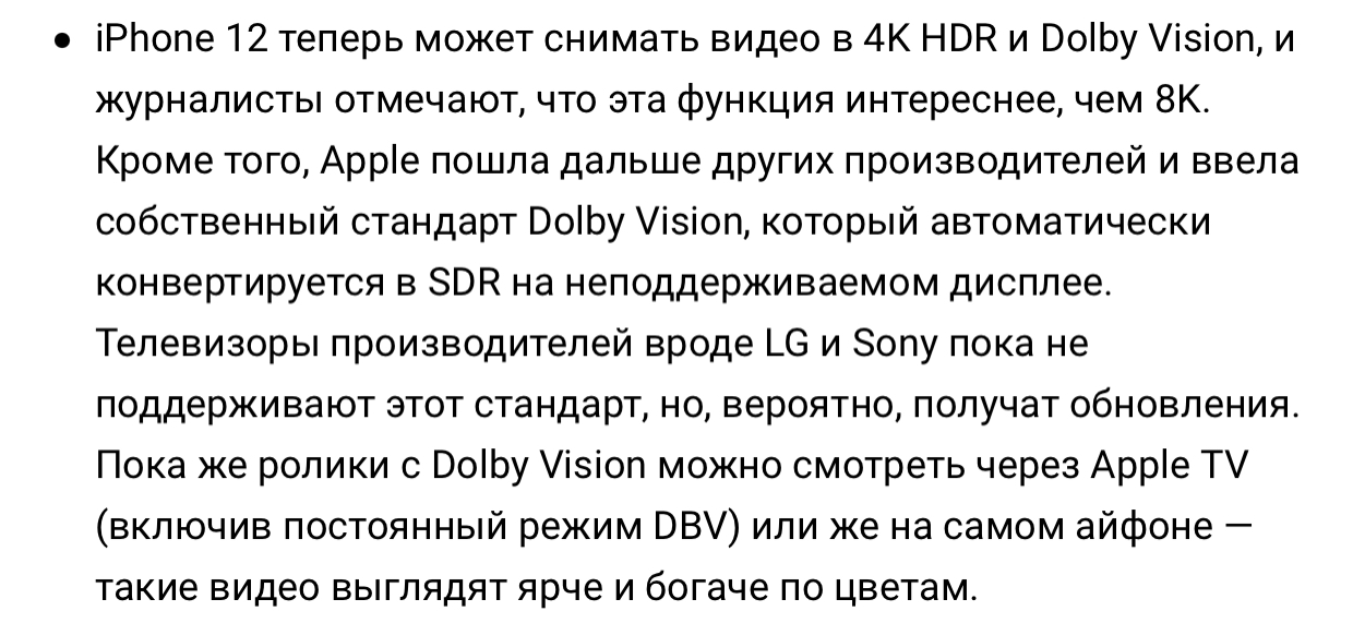 That said, new TVs will naturally support the newest versions of Dolby Vision, and you can always just plug in an Apple TV 4K and AirPlay to that. (The way iPhone 12 Dolby Vision video works with an Apple TV is wonky, though: you have to run the Apple TV in Dolby Vision mode all the time to make it work.If you are a sane person and use your Apple TV in SDR with “match content” turned on, you will still always see SDR video from an iPhone 12.I hope Apple fixes this very quickly.)