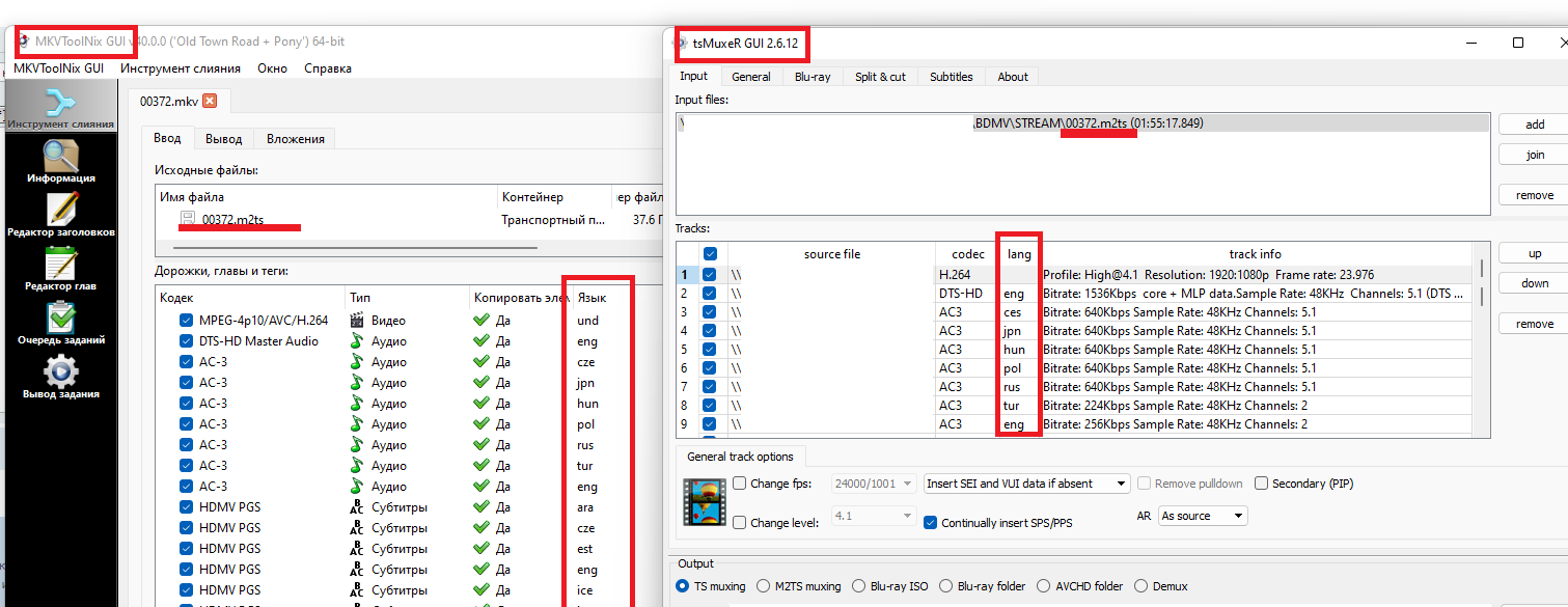 2) Но если этот же m2ts файл с фильмом скопировать в другой каталог и открыть его оттуда, то mkvtoolnix и tsmuxer не распознают язык для дорожек и субтитров (см. второй скрин).