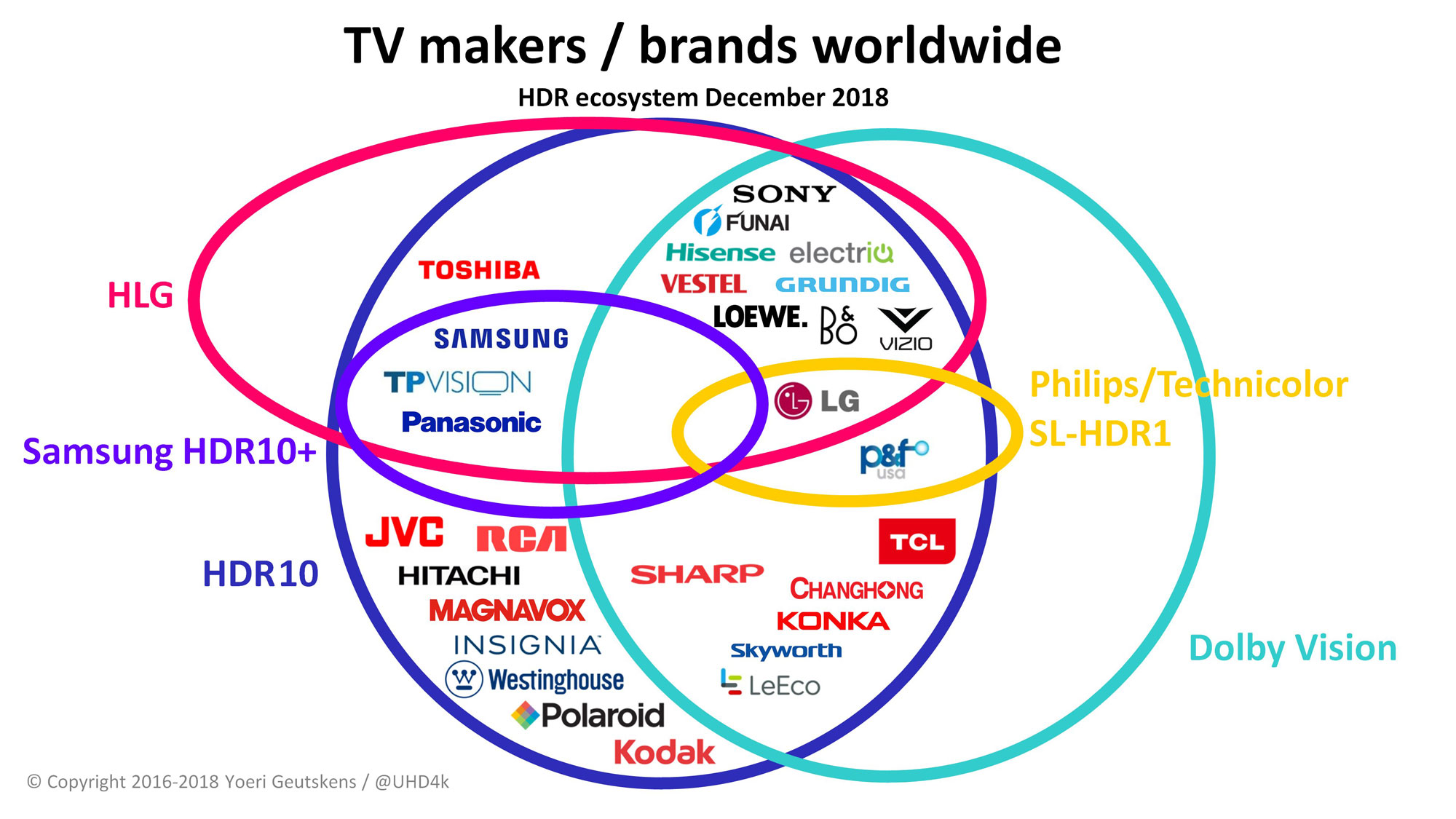 Выставка CES в 2018 году была некоей точкой - стартом для дальнейшего определения, кто главный в этих направлениях. Анонсировался некий "прорыв" со стороны формата HDR10+, который расставит все точки над i. Вместе с тем, прорыва не случилось, если им не считать представление логотипа HDR10+, а точки … можете их увидеть сами (см таблицу).