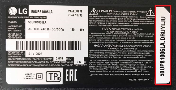 Пример полного наименования модели LG 50UP81006LA.DRUYLJU