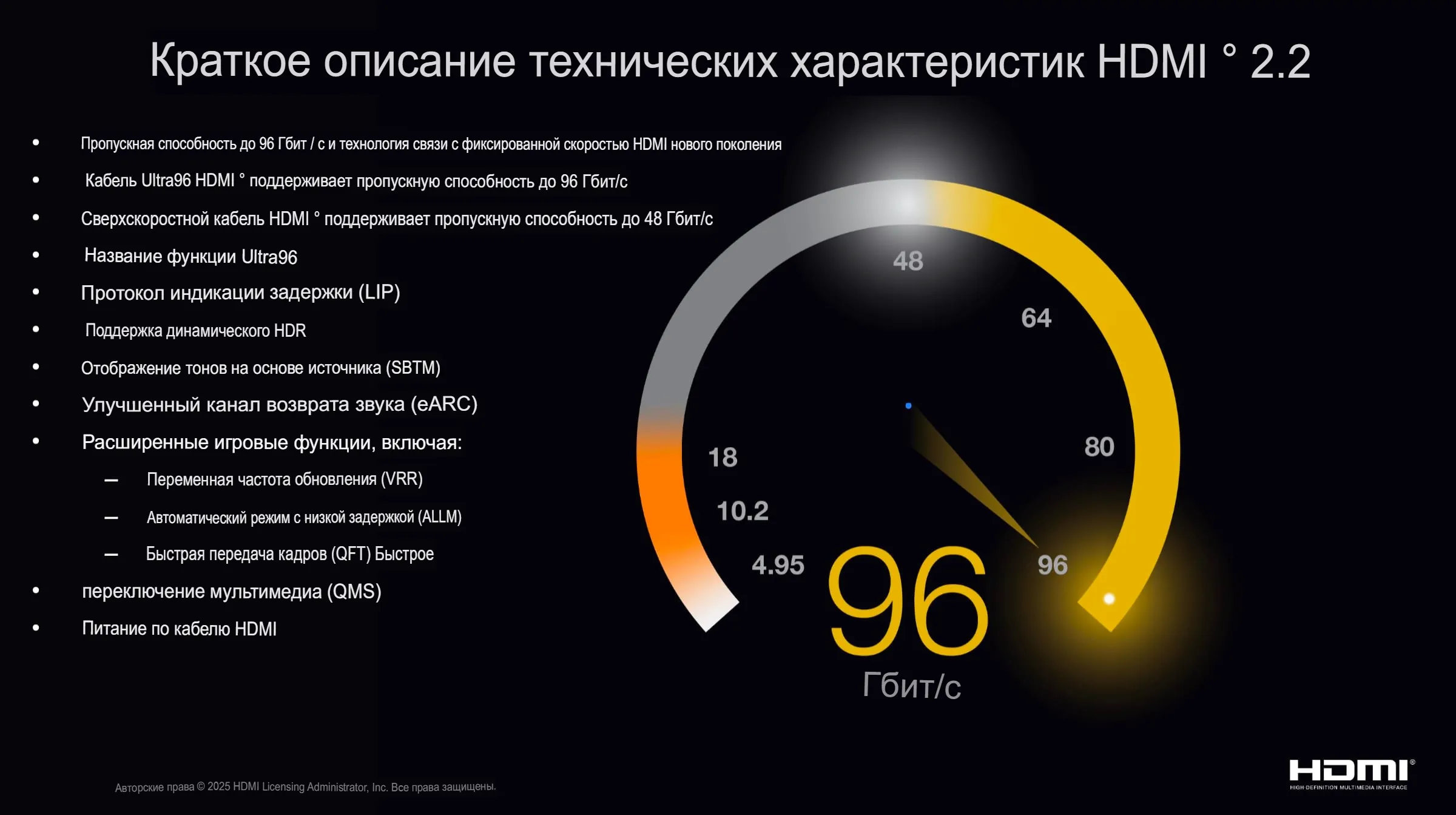Всего через полгода после анонса на CES 2025 консорциум HDMI выпустил окончательную спецификацию HDMI 2.2, открывая новую эру для телевизоров, игровых консолей и медиаустройств. Главное новшество - удвоенная пропускная способность до 96 Гбит/с, что позволяет поддерживать невероятные форматы вроде 4K@480Hz, 8K@240Hz и даже 16K@60Hz. Для работы на полной скорости потребуются новые кабели Ultra96 с сертификацией, хотя стандарт сохраняет обратную совместимость со старыми устройствами.