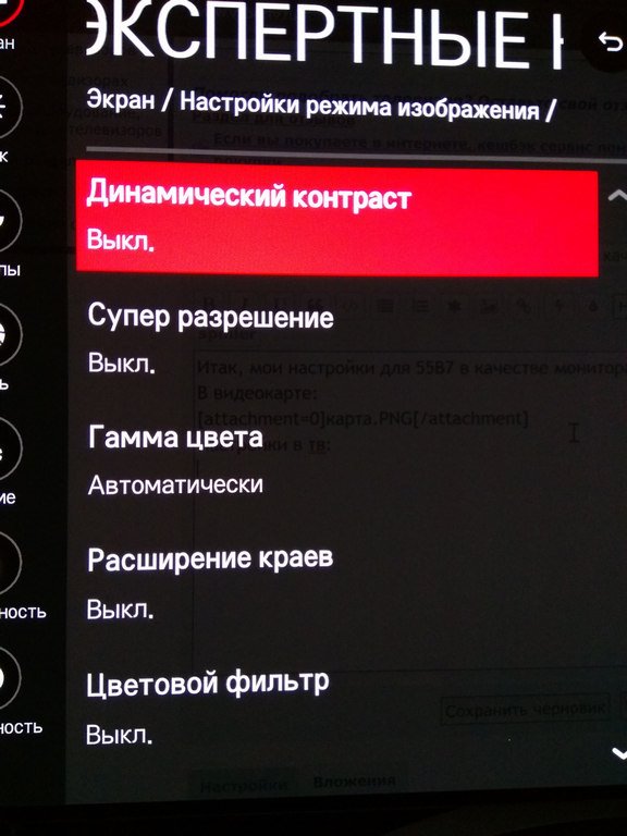 На 55EC9300 ПК режим (4:4:4) дает минимальный инпут лаг. Обычно использую режим изображения Эксперт1, т.к. в таком случае инпут лаг не возрастает. Игровой режим форсирует широкий цветовой охват и перенасыщенные цвета. Все остальные функции отключил. Уровень черного HDMI - Высокий, и аналогичное в видеокарте(Full RGB).