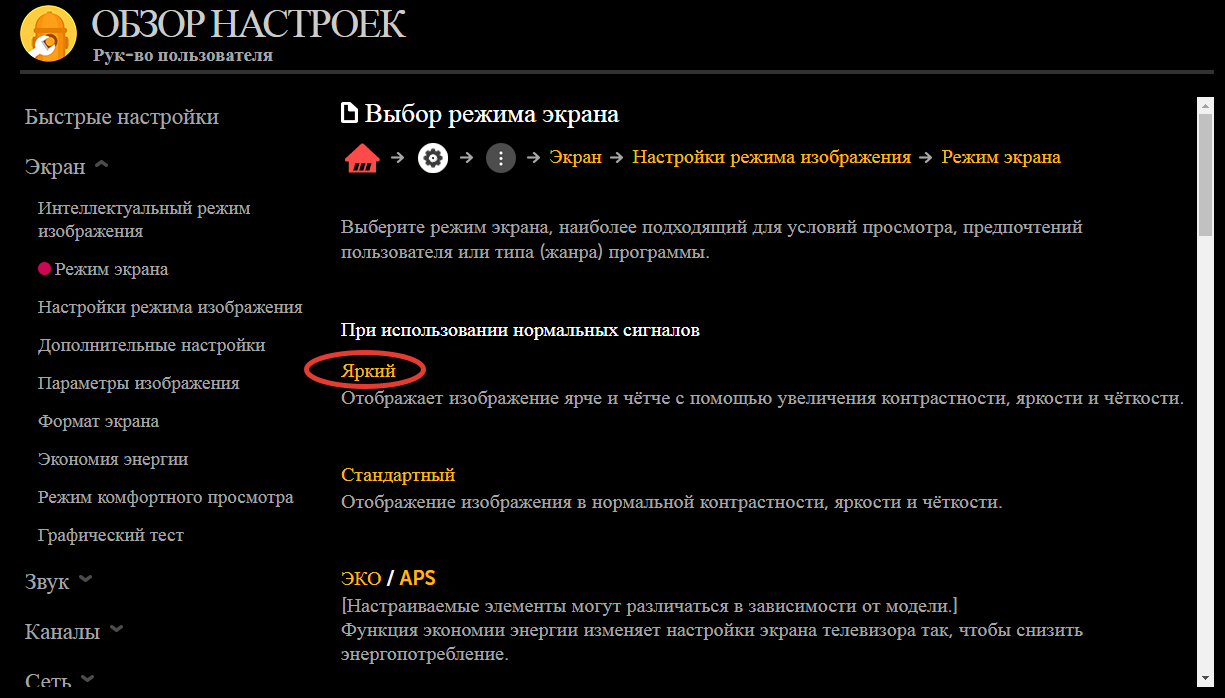 не совсем понимаю что за режим экрана "яркий", у меня свет OLED нельзя регулировать, есть режим экономии энергии выставлен в "автоматически". Когда выставляю в "Откл. ", то появляется возможность регулировать свет OLED. В других режимах (максимальный, средний и т. п.) не проверял