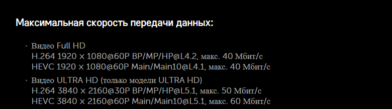 , а речь была о том, что такие параметры кодирования неприемлемы для встроенного плеера ТВ. В частности, для того, чтобы закодировать 10битный цвет в сигнале с разрешением кадра 1920х1080 кодеком h.264 релизером/автором материала был применен Format profile: High 10@L5, а железо ТВ способно (см. скрин) обработать данные из видеопотока с таким разрешением кадра, закодированные кодеком h.264 по профилю с уровнем не выше 4.2. Но сам я не занимаюсь кодировкой/перекодировкой видео, потому на вопросы