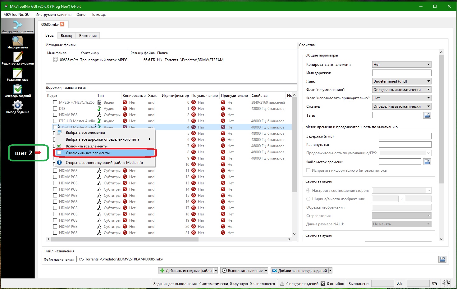 В моём случае поток "Видео 2" пришлось удалять, ибо "старый добрый HDR" не захотел воспроизводиться. Удалил также и те звуковые дорожки, которые мне не нужны или моему телевизору не по зубам прожевать.