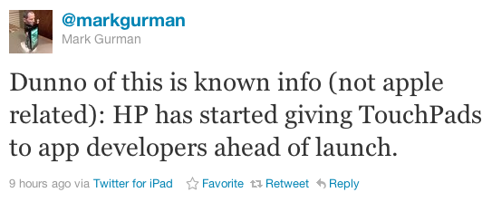 Как сообщает разработчик приложений для IOS Марк Гурман, компания HP уже выдает свои планшеты разработчикам перед началом официального старта. Пока ничего неизвестно, получили ли предварительный релиз таблетки другие разработчики, или же такое предложение поступило только для Гурмана.