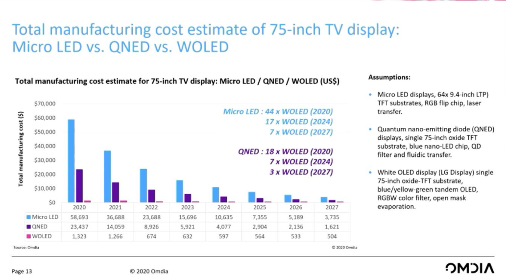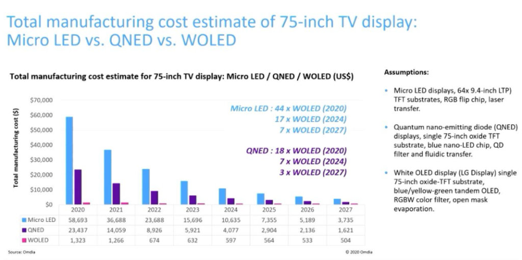 Пол Грей, аналитик рынка в Omdia, поделился диаграммой общей стоимости производства 75 дюймовых тв. с различными технологиями, а именно, микро лед, QNED, WRGB OLED. Из диаграммы видно, что в 2021 году базовая стоимость производства за 75 дюймовый микро лед будет составлять 37 00 долларов США (1:47). И это только производственная стоимость, которая не включает в себя стоимость распространения и розничную наценку. Поэтому, я думаю, когда эта технология станет доступной к продаже, то цена станет шестизначной, что не будет доступна массам.