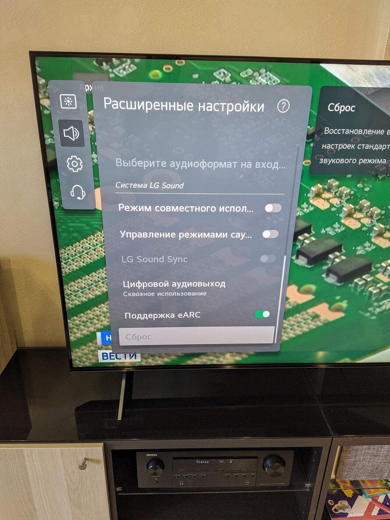 igorkzn писал(а):sleepwalker писал(а):Ресивер Denon AVR-S660H подключен по eArc. Выбран источник TV audio в режиме Direct. Иногда при включении телевизора, когда ресивер включается автоматом нет звука. Лечится просто переключением ресивера на другой вход и обратно. Вот вопрос это глюк ресивера или же глюк LG?