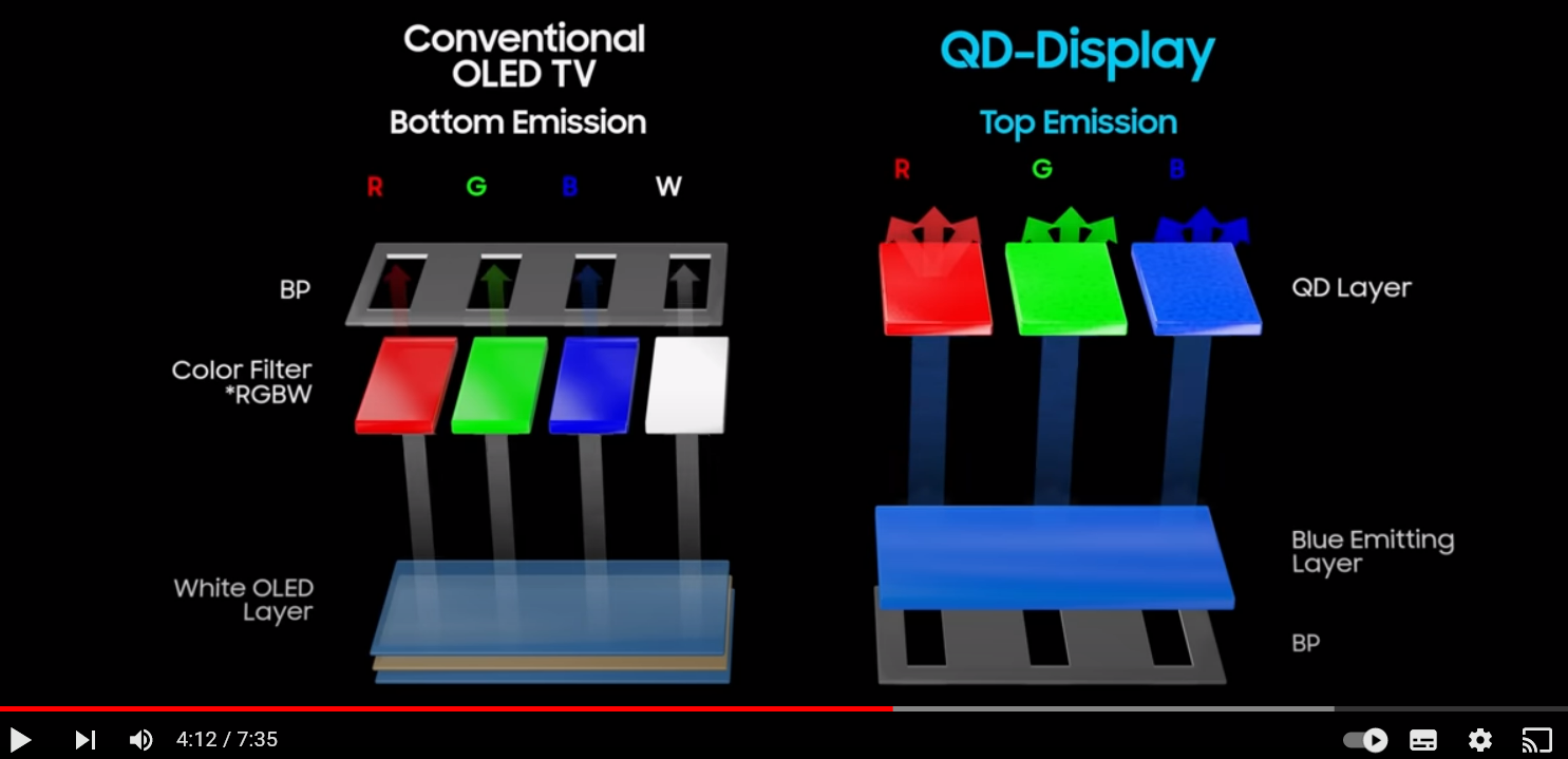 Просто для наглядности скрин из видео https://www.youtube.com/watch?v=GhZkzGX1Kls (само видео публиковать не вижу смысла, т.к. разбираемая в нем новость уже озвучена в AlexMaestro @ Телевизоры OLED (технологии, новости и устройства)), где видны принципиальные различия в технологиях WOLED и QD-OLED