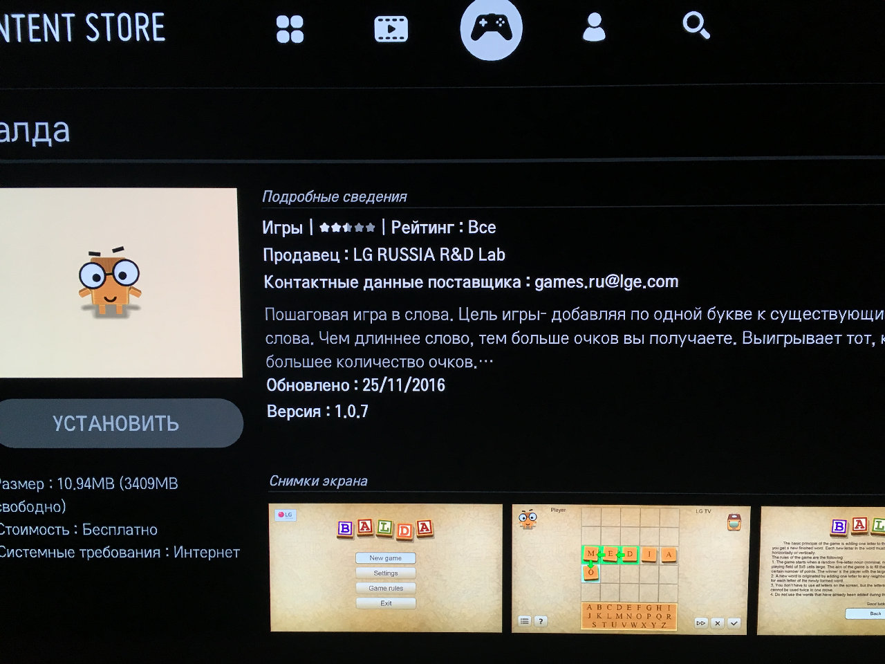 По какой-то причине игра не работает. Пишет, что данного слова (любого, даже простейшего) нет в словаре. Кстати, не работает и "Скорость интернета" из LG-магазина.