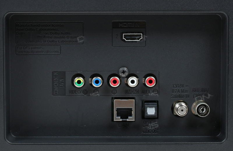 Задняя панель телевизора LG LK5400 оснащена следующими интерфейсами: один вход HDMI, 2 антенных (спутник/кабель) входа, компонентные входы по видео/аудио и 1 порт LAN. Что касается аудио, то на этой же панели расположен только оптический аудиовыход, а выход 3,5 мм для наушников и выход аудио RCA (тюльпан) на два канала, как в моделях 2016-2017 года, отсутствуют.
