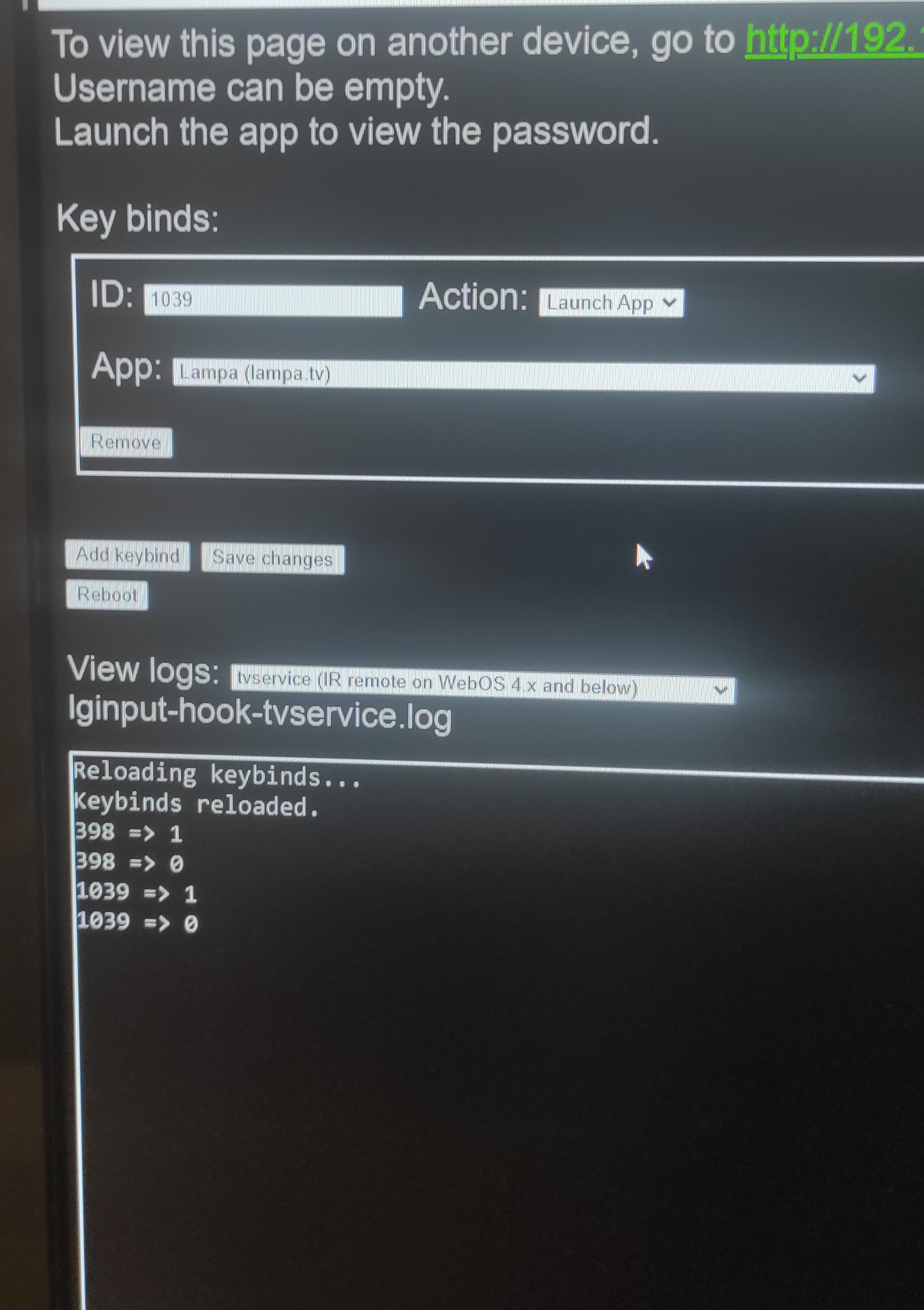 4) Смотрим в окошко lginput-hook-lginput2.log там внизу при нажатии на кнопки на пульте по два раза пишется IDшник нажатой кнопки после нажатия. Не обращаем внимание на то, что на телеке в этот момент запускаются приложения и тд, мы смотрим все в LG Input Hook с другого устройства (компа).