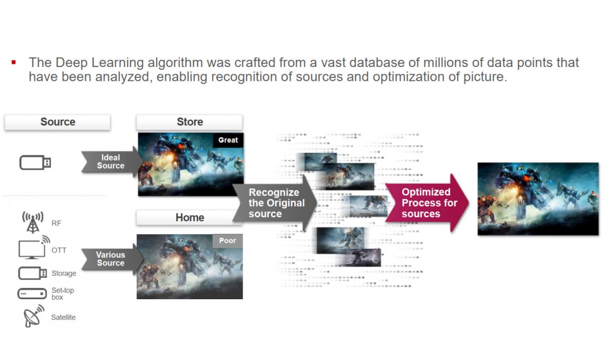 The improvements in terms of image quality all come from the new Alpha 9 Gen2 processor. The most important new asset of this processor is the addition of 'Deep Learning' algorithms. The concept is similar to that of Samsung (and that of Sony). A very large library of video content is created in different quality levels and then pairs are analyzed. The resulting algorithm first attempts to recognize the quality of the source and uses an optimized process to improve image quality based on that. According to LG, the impact should be visible especially with images with very low quality. The demo used a high quality source, and the improvement was barely visible there.