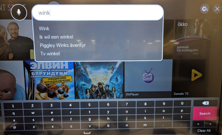 На появившейся экранной клавиатуре введите название приложения wink и нажмите Search (Поиск). На пульте Magic Remote можно нажать кнопку с микрофоном и произнести "Wink".