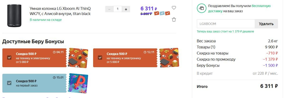 Умная колонка LG Xboom WK7Y c Алисой за 6311? - для новых пользователей и 6811? - для старых, везде 9990?. Чтобы заполучить "Алису" за такую классную цену, добавьте этот и этот купоны и примените в корзине промокод LGXBOOM.