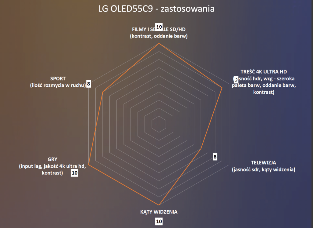 Кроме того, стоит упомянуть истины, которые являются универсальными с момента появления этой технологии на рынке - абсолютно хороший черный и контрастный, что дает незабываемые показы в условиях кинотеатра и сенсационные углы обзора. OLED-экраны - единственные, которые предлагают эти качества на таком высоком уровне. Кроме того, они очень хорошо подходят для игр, фильмов, сериалов и спорта. В принципе, что-то хорошее для всех. Здесь также стоит отметить, что органические телевизоры LG лучше всего подходят для использования в помещениях с сильным освещением (благодаря стабильности уровня яркости). Проблемы OLED и LCD должны рассматриваться отдельно, с учетом всего содержания теста, а не самого резюме, поэтому я буду избегать проблем с преднамеренностью. Лично для меня это самый полный телевизор с точки зрения качества изображения и мультимедийных ценностей. Вот почему я дал ему первое упоминание в этом году.