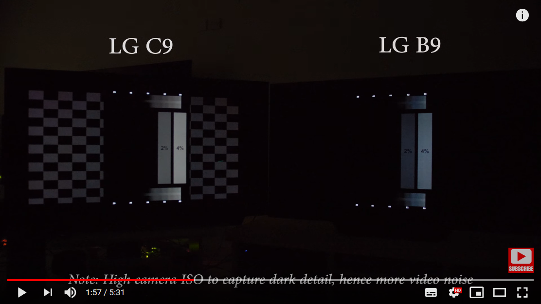 Винс утверждает, что на C9 картинка в тенях заметно чище, а на B9 с якобы обновлённым старым чипсетом, чтобы частично замаскировать проблемы, LG решили ещё больше затемнить гамму в тенях.