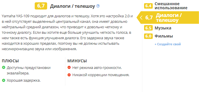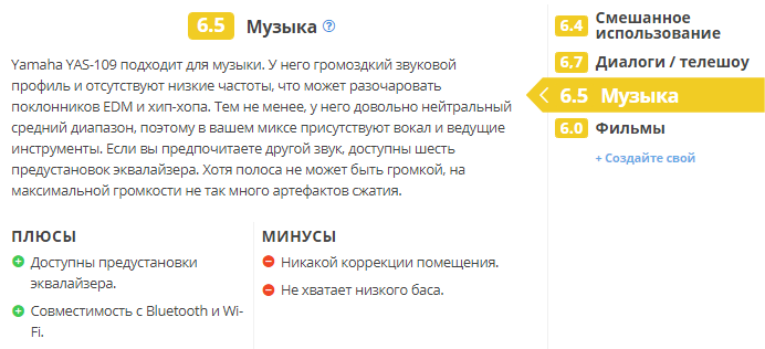 Обзор саундбара Yamaha YAS-109Yamaha YAS-109 - это установка версии 2.0 с 2019 года. Это следующее поколение Yamaha YAS-108 / ATS-1080, добавляющее порт Ethernet, шесть предустановок эквалайзера, встроенный голосовой помощник Alexa и возможности беспроводной связи Wi-Fi. Тем не менее, он имеет многие из сильных и слабых сторон своего предшественника. Несмотря на то, что он имеет два встроенных сабвуфера, он все еще изо всех сил пытается воспроизвести тяжелые басы. Кроме того, он должен микшировать объемный контент в стерео, чтобы воспроизвести его, что не кажется иммерсивным. Тем не менее, хотя он не может быть очень громким, на максимальной громкости не так много артефактов сжатия, поэтому ваш звук довольно чистый и на большой громкости.