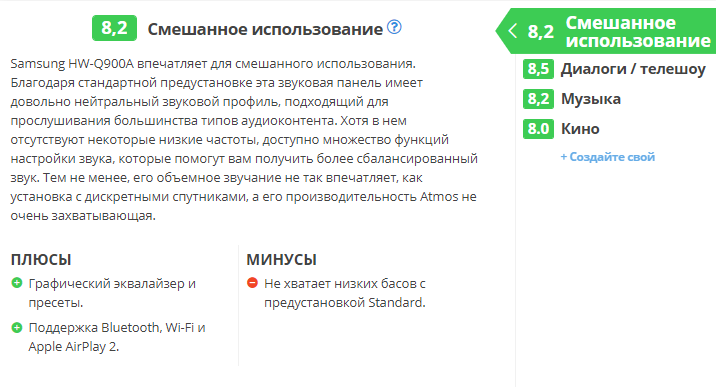 Samsung HW-Q900A - это установка 7.1.2, выпущенная в 2021 году. Это обновленная версия Samsung HW-Q900T, и, в отличие от своего предшественника, она поддерживает Apple AirPlay 2 и имеет функцию коррекции помещения Auto EQ. Он предлагает некоторые функции улучшения звука, которые работают с совместимыми телевизорами Samsung для создания более захватывающего звука, такие как Q-Symphony и SpaceFit Sound +, хотя в настоящее время мы не тестируем их. Он предлагает довольно нейтральный звуковой профиль, поэтому подходит для прослушивания различных типов аудиоконтента. Он также становится довольно громким и имеет множество функций настройки звука.