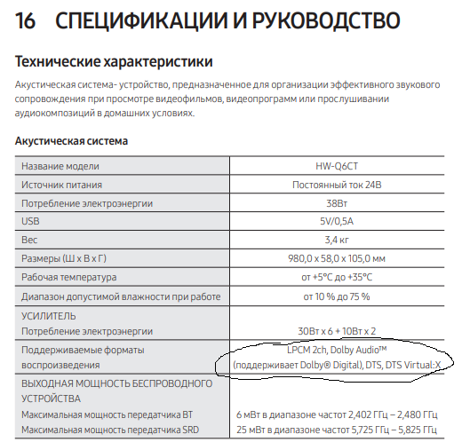 narpol писал(а):Но не суть, сами подробно эту модель изучали/читали или смотрели о ней обзоры и т. п. (если да, то ссылки на технические источники приведите)? Т. к. я все отвечал просто по информации с сайта производителя, а вот например на https://www.rtings.com/soundbar/reviews...g/hw-q59ct для ОЧЕНЬ БЛИЗКОЙ по маркировке модели Samsung HW- Q59CT указана поддержка DTS, например. Так что не факт, что на сайте производителя просто не забыли что-то указать.