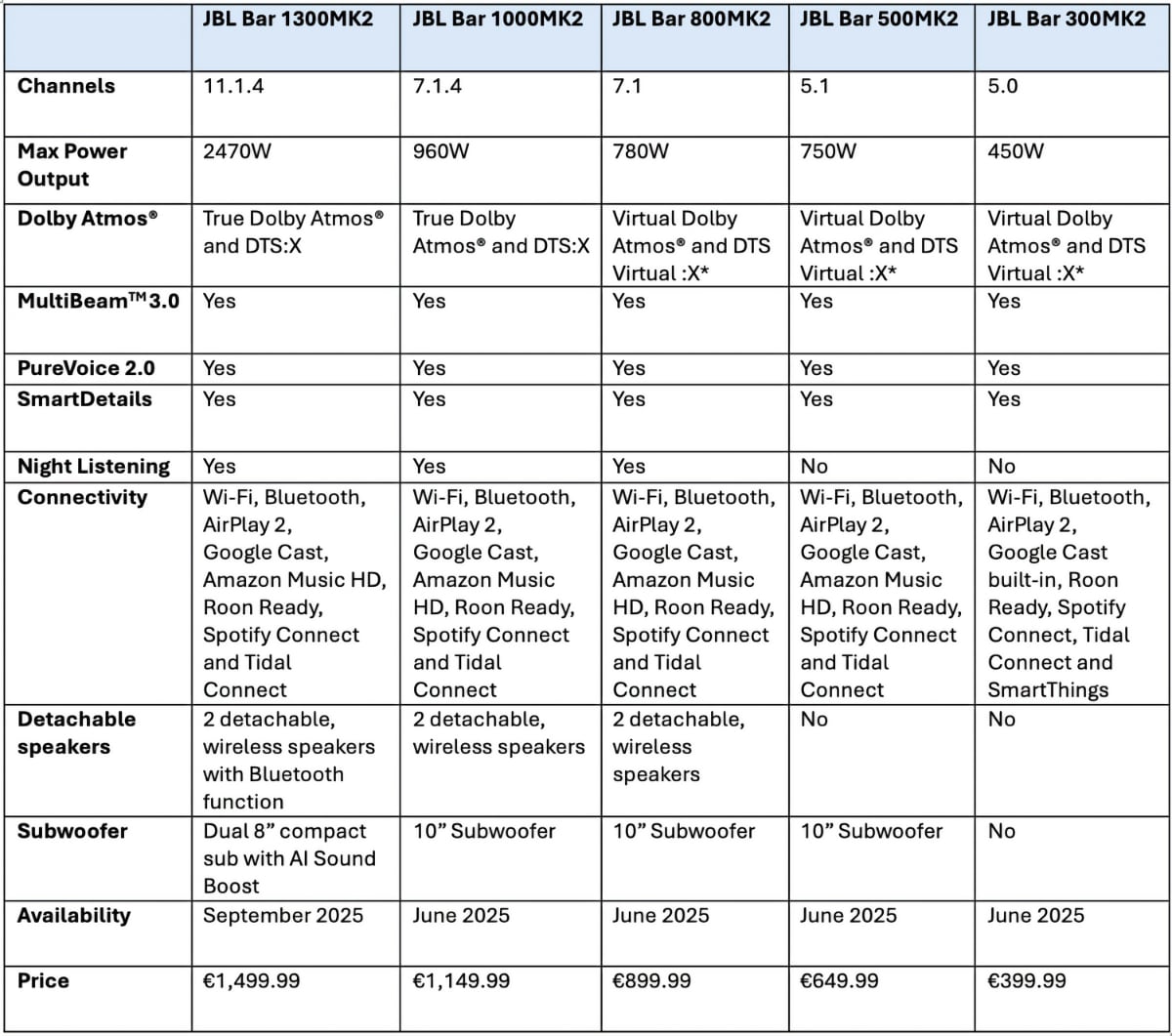 С выходом новых моделей JBL увеличивает мощность Bar 1300MK2 и Bar 1000MK2, делая их более мощными для просмотра фильмов. Эти две звуковые панели также оснащены направленными вверх динамиками для Dolby Atmos и DTS:X. В комплект входят съемные задние динамики, которые можно подключить к звуковой панели для зарядки, когда они не используются. Для просмотра фильмов их можно настроить отдельно. Их также можно использовать в качестве Bluetooth-динамиков для прослушивания музыки или в ночном режиме, когда звук выводится только из задних динамиков, а не из звуковой панели, поскольку они расположены ближе к месту прослушивания. Обновленная версия технологии MultiBeam предназначена для расширения звукового пространства в гостиной, а PureVoice 2.0 улучшает качество диалогов, чтобы было легче слышать, что говорят люди на экране.