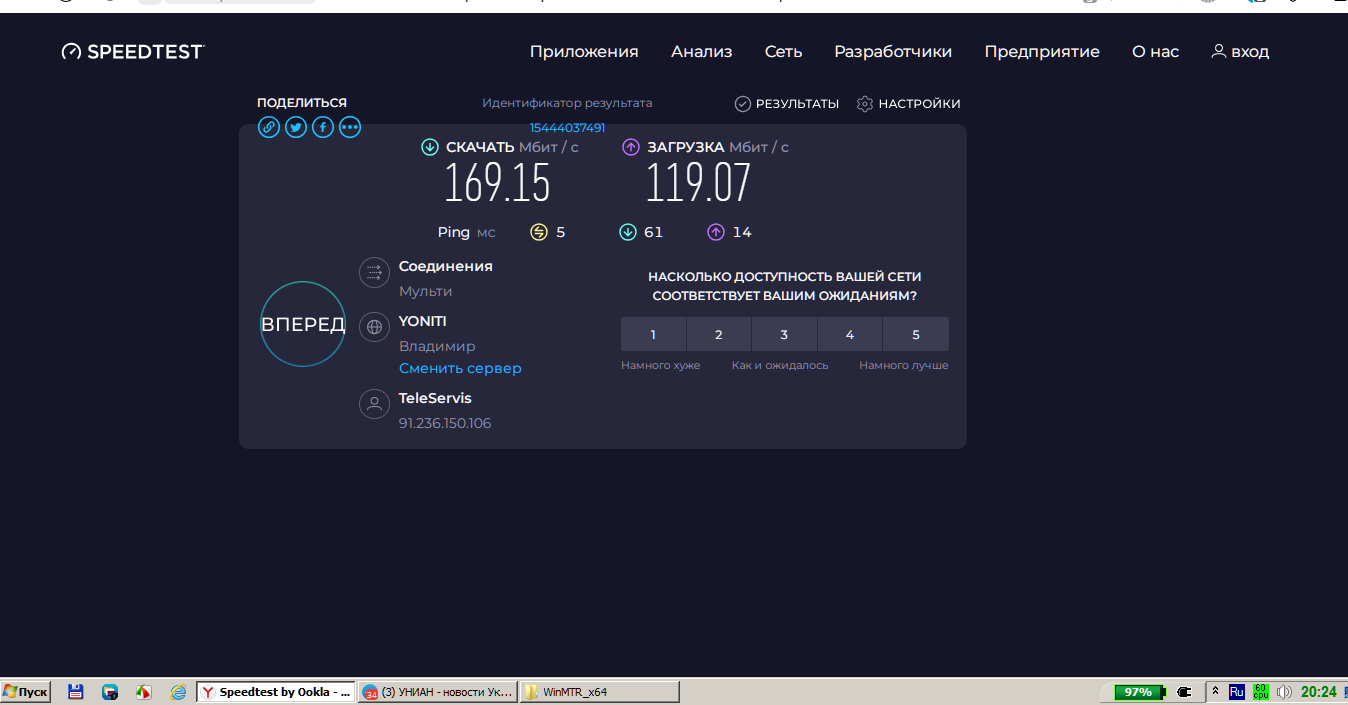 Добавлено спустя 2 минуты 43 секунды:Скорость по спидтест в момент падения скорости до ваших серверов до YONITI Владимир и
