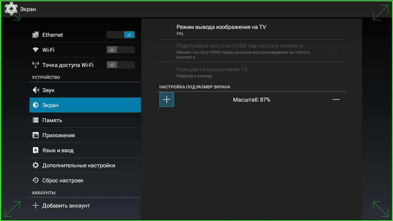 Третий раздел – отвечает за параметры видео. Здесь можно подстроить изображение под размер экрана, выбрать желаемое разрешение экрана или режим автоматической настройки разрешения, а также включить автоматическую смену частоты кадров в зависимости от частоты кадров в проигрываемом видео. Здесь я обнаружил пару странностей. Во-первых, при установке фиксированного разрешения и частоты, опция автоматической подстройки частоты кадров становится не активна. Пока я не понял логики разработчиков. В других приставках на том же Realtek RTD1195 эта опция прекрасно соседствует с различными режимами вывода. Вторая странность была обнаружена в тесте AnTuTu. В нем, почему-то указано, что текущее разрешение составляет 1280х720 пикселей, и это при том, что я принудительно установил режим 1080p, что подтверждается средствами телевизора. Пока сложно сказать что это, маленькая хитрость, которая позволит несколько увеличить быстродействие приставки, или незамеченный глюк.
