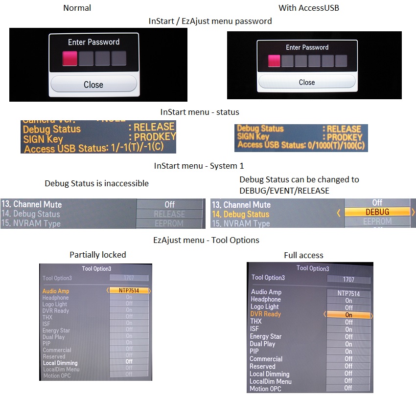 Физически по видимому представляет собой девайс типа "флешка", втыкаемый в USB телевизора (кэп :)). При подключенном AccessUsb в меню InStart/EzAjust предлагается ввести 6-символьный пароль вмосто стандартного 4-символьного, при этом правильность введенного пароля проверяет AccessUsb.