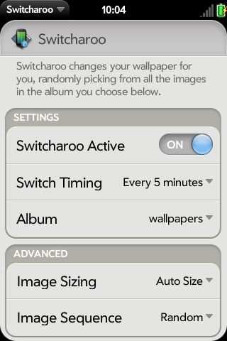 Switcharoo это отличная утилита для webOS, которая будет случайным образом переключить обои на основе заданного графика (один раз в час, раз в день, и т.д.). Она включает в себя меню настроек, которые позволяют выбрать альбом, который будет использоваться в качетсве источник переключатель образов. Вы можете также выбрать опцию "Все изображения", которая включает отображение всех изображений из всех альбомов.