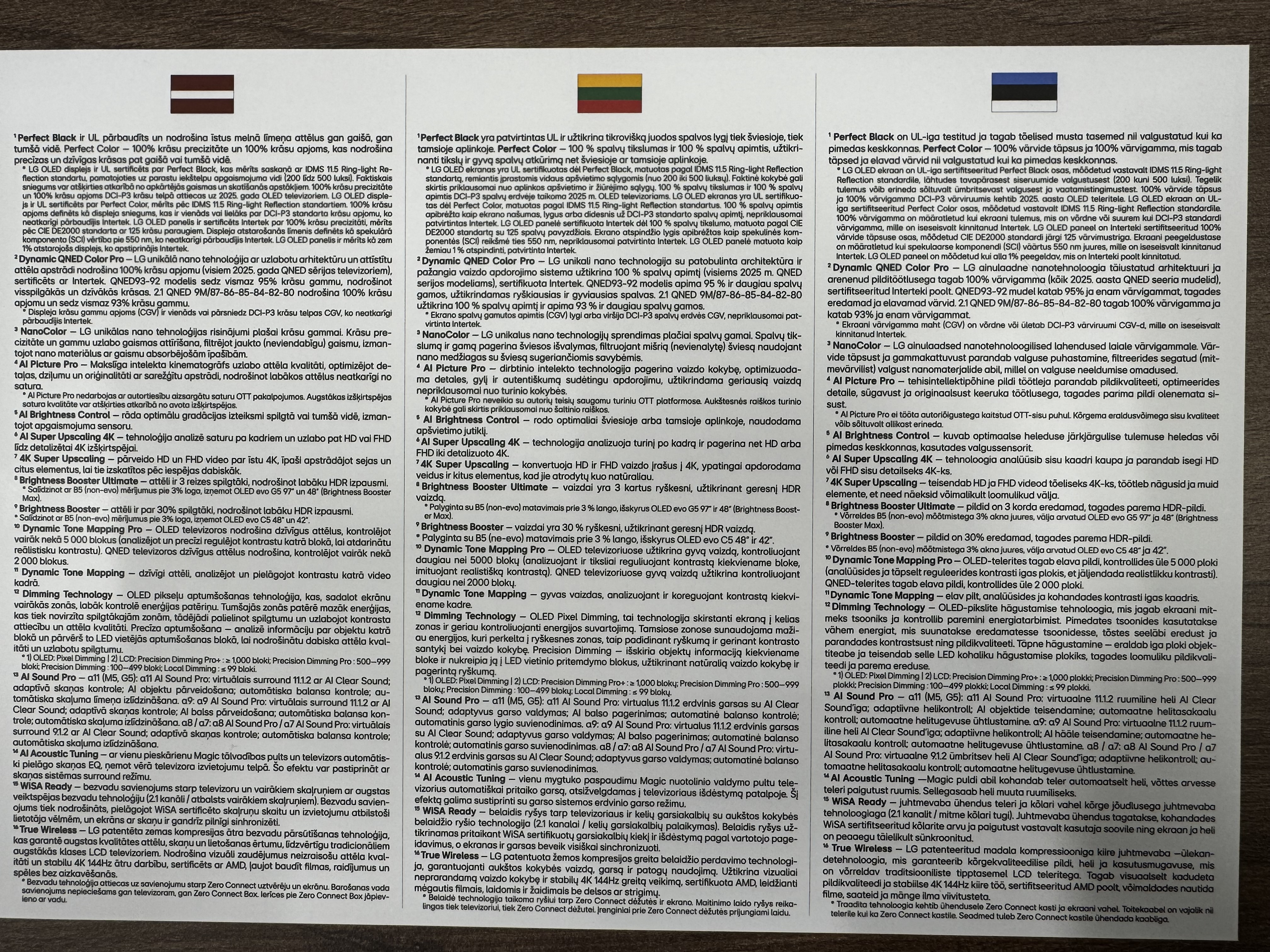 • LG OLED-дисплей сертифицирован UL для Perfect Black, измеренного в соответствии со стандартом IDMS 11.5 на основе типичных условий освещения в помещении (от 200 до 500 люкс). Фактические характеристики могут отличаться в зависимости от внешнего освещения и условий просмотра.100% точность цветопередачи и 100% цветовой охват в цветовом пространстве DCI-P3 будут действовать с 2025 года. Для OLED-телевизоров LG OLED-дисплей сертифицирован UL для Perfect Color, измеренного в соответствии со стандартом IDMS 115 Ring-light Reflection.100% цветовой охват определяется как характеристики дисплея, равные или превышающие цветовой охват стандарта DCI-P3, что было независимо подтверждено компанией Intertek. OLED-панель LG сертифицирована Intertek на 100% точность цветопередачи, измеренную в соответствии со стандартом CIE DE2000 с использованием 125 цветовых образцов. Уровень отражения экрана определяется значением зеркальной составляющей (SCI) при длине волны 550 нм и подтвержден независимой проверкой Intertek. Отражательная способность OLED-панели LG составляет менее 1%, что подтверждено Intertek.