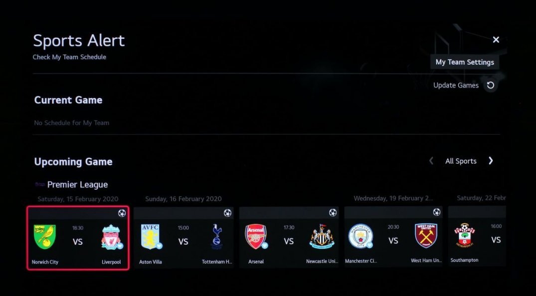 Другой новой функцией платформы является Sports Alert, с помощью которой можно выбрать любимую спортивную команду и получать уведомления о предстоящих матчах и результатах прошлых игр с ее участием. Если такой матч будет транслироваться на одном из доступных каналов, то телевизор предложит переключиться на него.