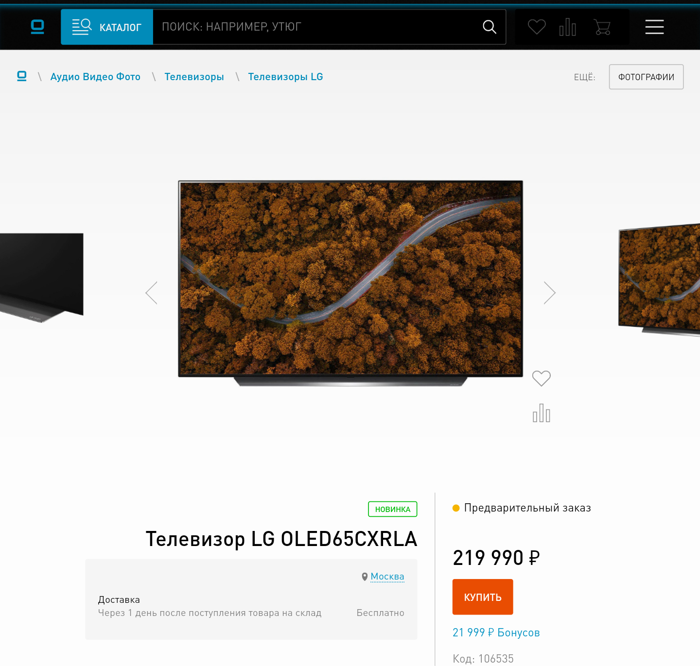 Технопарк уже предлагает купить LG OLED 65CX (по предзаказу) по цене 220 тыс. руб.