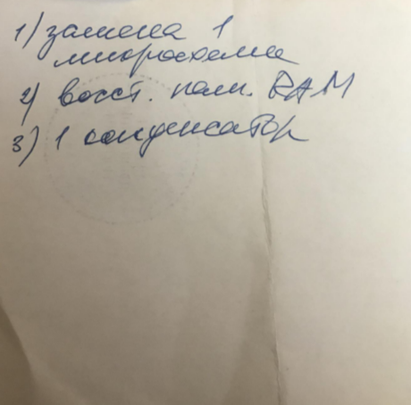 В итоге за указанную сумму были "выявлены и устранены перечисленные дефекты"2 пункт смущаетЕсли делал специалист, который знает эти аппараты, то как раз этот пункт вообще не смущает. Если просто мастер, то смущает и сильно. Как и пункт о замене микросхемы, тип и наименование которой не указаны.протёк конденсатор, сгнили ноги и сдохла мелкосхема RAM и ещё что-то из обвязки. Почему бы и нет.Эта запись сделана на обороте квитанции уже приемщицей (просто со слов мастера, занимавшегося ремонтом - в ходе ее телефонного разговора с ним по моей просьбе, когда у меня тоже возникли какие-то опасения после первоначального звонка просто о готовности заказа без пояснений, что было/сделано. Хотя обычно еще предварительно звонят и согласовывают состав и стоимость ремонта), это она переписала на обороте моего экземпляра квитанции какие-то свои пометки из того разговора.Если производился ремонт с заменой компонентов, то у этих компонентов есть наименование, которые вообще не проблема предоставить вместе с самими сдохшими. Но обычно "мастера" просто игнорируют этот момент. А иногда просто подсовывают вообще левые детальки.