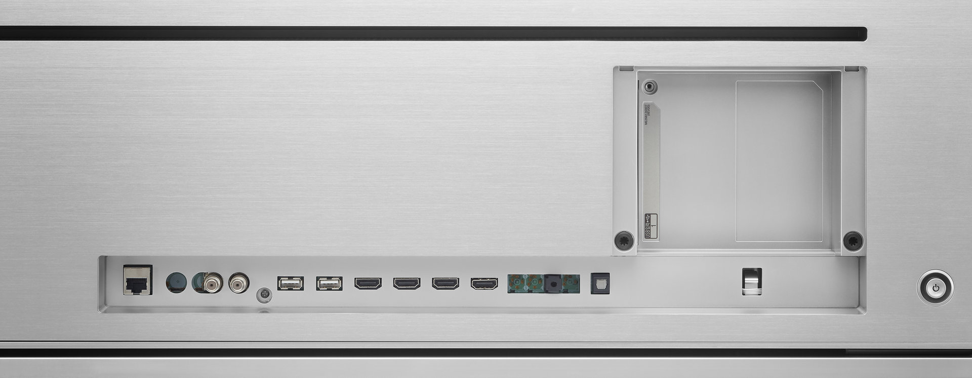 Задняя панель телевизора LG RX (точнее его подставки) оснащена следующими интерфейсами: 4 входа HDMI v.2.1 (один из которых совместим с ARC и eARC), 2 антенных входа (для спутникового и кабельного/эфирного ТВ), один порт LAN (со скоростью 100 Мбит/сек), три порта USB (версии 2.0) и слот условного доступа CI+. Что касается аудио, то на этой же панели расположен оптический аудиовыход и выход 3,5" на наушники/акустику, а также компонентный AV-вход (в версии для США).