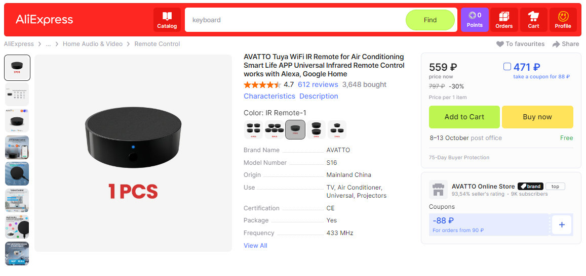 ИК пульт универсальный с али, работает как родной яндексовский.