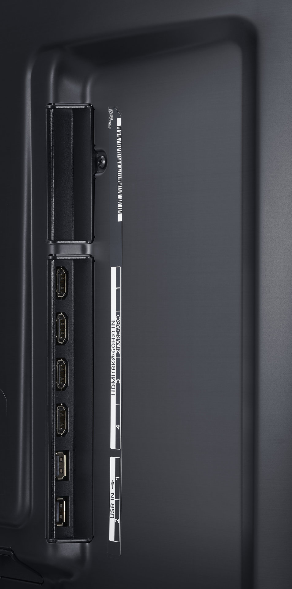 Боковая панель оснащена четырьмя входами HDMI v.2.1 (один из которых совместим с ARC и eARC), двумя портами USB (версии 2.0) и слотом условного доступа CI+. Кроме того на борту имеются встроенные беспроводные модули Wi-Fi (с поддержкой стандартов 802.11a, 802.11b, 802.11g, 802.11n, 802.11n 5 ГГц, 802.11ac, Wi-Fi Direct) и Bluetooth (поддерживается сопряжение с совместимыми устройствами по протоколам Bluetooth 5.0 и apt-X).