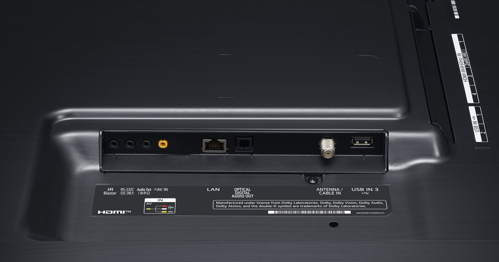 Нижняя панель телевизора LG NANO95 оснащена следующими интерфейсами: 2 антенных входа (для спутникового и кабельного/эфирного ТВ), компонентный AV-вход (только в версии для США), один порт LAN (со скоростью 100 Мбит/сек) и один порт USB (версии 2.0). Что касается аудио, то на этой же панели расположен оптический аудиовыход и выход 3,5" на наушники/акустику.