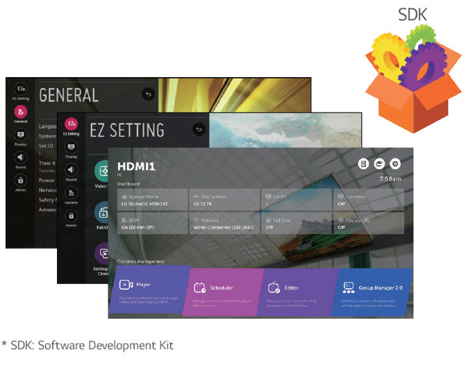 Интеллектуальная платформа LG webOS поддерживает веб-интерфейс HTML5 и предлагает SDK, что позволяет системным администраторам легко создавать свои собственные приложения для решений для клиентов.